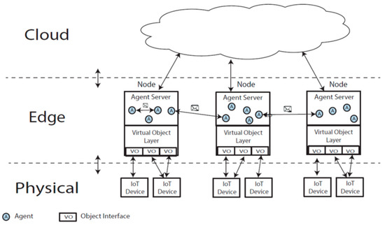 The software architecture that supports the Power Cloud management model is depicted in Figure 6. The architecture is based on “Rainbow” [29], a platform for the development of distributed applications pertaining to domains such as those related to cyber physical systems, fog computing, pervasive computing and the Internet of Things. Rainbow is written in Java, is highly modular, and includes three layers: the low or “physical” level, the medium or “edge” layer, and the high or “cloud” level. The physical layer is composed of physical objects and devices, which in the case of the Power Cloud are provided by the nGfHA and, eventually, the home automation systems and. The edge layer includes a set of servers (nodes), each of which contains two sublayers that provide the essential abstractions and functionalities for building the applications: the agent sublayer and the virtual object sublayer. The agent sublayer is characterized by an agent server on which a set of agents execute and interact with each other. Agents are entities that pursue their goals flexibly and autonomously while interacting with each other via message passing. In multi-agent systems [30], the interaction of multiple agents can produce complex emergent behaviors that possess many interesting properties such as adaptivity, resilience and fault tolerance. The virtual object sublayer contains a set of “virtual objects”, which are software abstractions of the actual physical devices.