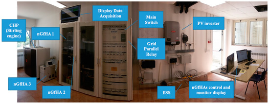 As an example, let us focus on one of the campus buildings, Chiodo2 (see Figure 8). In Chiodo2, three nGfHAs are installed and connected to a common DC bus, operating as a unique hybrid AC/DC (alternating current/direct current) microgrid. An energy meter is installed as interface between the DC microgrid and the Unical distribution grid. In this way, when the local generation and/or the ESS are not sufficient to satisfy the load demand, the energy deficit is absorbed from the Unical distribution grid. The interface switch installed below the energy meter is compliant to the Italian grid interconnected standard. It is open when the DC microgrid needs to operate in islanded mode. As illustrated in Figure 9, not all the loads are supplied in the case of islanded operating mode, but only the essential loads (the loads that do not tolerate a blackout or a low-quality supply). In each nGfHA, a switch device Si (i = 1…3) can disconnect the nanogrid from the local AC grid, so that the three nGfHAs will operate as isolated DC microgrids. The nGfHA 1 interfaces the ESS with the DC bus supplying the essential loads of the same nanogrid. The photovoltaic plant, installed on the rooftop, is interfaced by the nGfHA 2, while a stirling mCHP is interfaced by the nGfHA 3 [32]. An overall picture of the hybrid AC/DC microgrid is reported in Figure 10, while the information flows between the SEB and CEP are depicted in Figure 11.