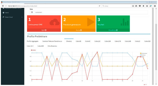 The SEB includes a 7-inch touch-screen, a Raspberry Pi3 a Tapko KNX sim, and a user-friendly interface through which the user sets his/her preferences regarding the schedulable load and the thermal comfort [33]. It communicates with the CEP and asks for services such as the hourly electricity prices and the hourly PV generation forecast. Therefore, it uses these data along with the user’s preferences to compute the optimal loads and production scheduling profile, thus activating the SEB workflow reported in Figure 5. At the end of the first stage, step 3 of Figure 5, a load and production scheduling profile is determined as depicted in Figure 12.