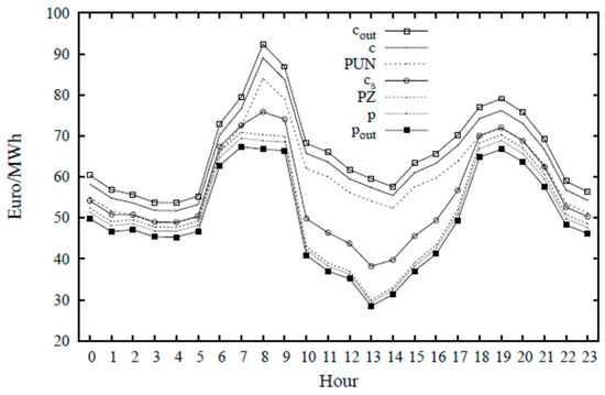 Before showing the benefits of the Unical Energy Cloud in terms of energy and economic performance, in the following, we briefly discuss the prices associated with the energy exchanges and how the Unical Energy Cloud can achieve benefits in this context. Indeed, even though the presented results refer to a case study subject to rules of the Italian energy market, the approach is valid for all the cases in which the energy cost changes hour-by-hour, due to free-market fluctuations, and where a gap exists between the selling and purchasing price. In this context, the prosumers that organize themselves in an aggregate form (energy community) can achieve benefits for two main reasons: (1) the energy community, as a whole entity, can negotiate directly with the energy provider that applies wholesaler energy prices and (2) the energy exchanges inside the energy community can be optimized.