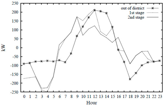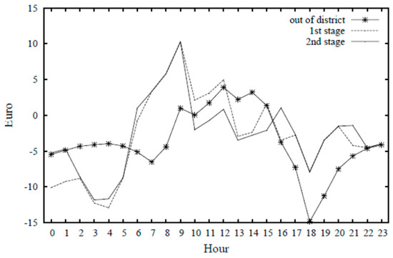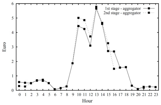 Beyond the advantages experienced by the prosumers, the adoption of a district allows the community to gain an additional economic advantage, which is obtained by the aggregator but of course can be redistributed to the prosumers, or used for other purposes such as maintenance, investments, etc. To illustrate this aspect, Figure 16 reports the hourly revenues of the aggregator for the first stage and second stage scenarios. It is worth noticing that this revenue can be achieved only in the presence of a district, while no such revenue exists in the out-of-district scenario.