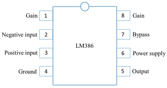 The energy conversion module contains a power amplifying circuit, signal input and output terminals, and a power terminal. When the energy conversion module is operating, its temperature increases. The positive and negative poles of a solar panel are connected to the input pins of the energy conversion module using wires. Because ambient light in the environment can affect a solar panel and generate noise, the panel was modified to include a masking structure. The energy conversion module adopts a low-voltage LM386 chip (U.S. National Semiconductor, city, state abbrv. if USA, country) [,], which is equipped with a pin function (Figure 1). These chips are commonly used in low-voltage consumer products to minimize peripheral chip components. The LM386 chip’s voltage gain is typically set to 20. However, by adding an external resistor and a capacitor between pins 1 and 8, the voltage gain can be arbitrarily adjusted up to a maximum value of 200 (Figure 2).