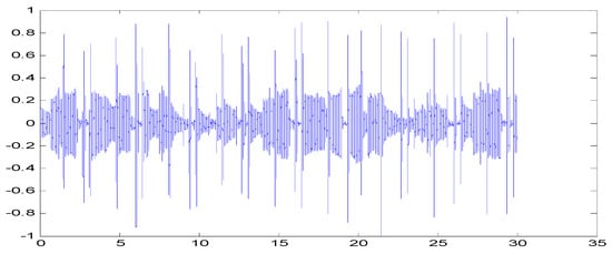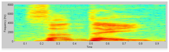Signal characteristics are difficult to recognize by observing changes in the amplitude of an audio signal over time (Figure 7). Converting an audio signal into a spectrogram (Figure 8) allows sonic characteristics to be identified []. The amplitude value of an audio signal in the time domain is often converted into an energy distribution in the frequency domain for observation. Various energy distributions in the frequency domain represent different speech characteristics. A signal changes rapidly and constantly over time, leading to inaccurate observation. Therefore, the most commonly used technique is conversion of the audio signal from the time domain to the frequency domain, enabling the identification of the spectral characteristics of various sounds through their energy distribution. The spectrum is a representation of a time domain signal in the frequency domain and can be obtained by performing FFT on the signal [,,,,,]. The result is presented as a spectrogram, with the amplitude or phase as the vertical axis and the frequency as the horizontal axis (Figure 9).