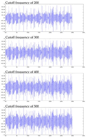 Figure 15 shows the different levels of filtering effects at different cutoff frequencies. The treble part is almost deleted after filtering. Only the sound of the bass survives, and then the bass sound that appears through these regular rules allows us to track the beat.