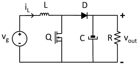 For the purpose of this paper, an application example is used, specifically a boost converter, to explain every process in detail. The topology of the boost converter is shown in Figure 1. For the sake of clarity, the proposed model is the simplest one and does not contain losses, but similar conclusions could be drawn for other topologies. The model needs to calculate the state variables, namely the capacitor voltage (vout) and the inductor current (iL) in every time step considering the state of the switch.