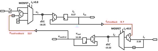 For the implementation, the number of bits for every signal in the boost converter should be selected. Firstly, the signals, which are shown in Figure 2, have to be classified. The state variables (iL and vout), constants (dtL and dtC), inputs (vg and ir), outputs (iin and voutExt), and feedback signals (voutFeedback and iLFeedback) are shown in red.
