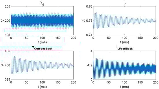 The first set of simulations are carried out starting with initial conditions vout = 400 V and iL = 0 A. The waveforms of the inputs and feedback signals are shown in Figure 3. Here, iR has the same kind of waveform as vout because a resistive load is simulated. Regarding vg, which is an independent input, as this application example is a DC–DC conversion, it could be a constant. However, if it was constant, it would be difficult to study the necessary number of bits in its associated feedback signal (voutFeedback), as will be explained later. That is why white noise is superimposed to the average value of 200 V, as shown in Figure 3.