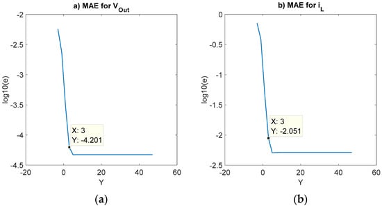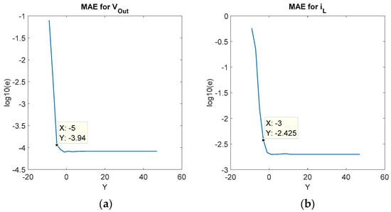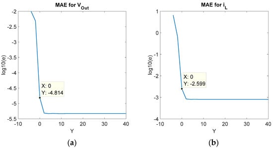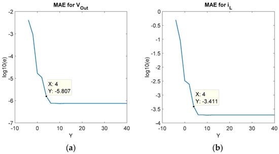 As previously explained, the first experiment checks the error when all the signals have 24 bits more than those theoretically necessary (as shown in Figure 2), except vg and voutFeedback. Here, vg is set to Q9.3, while voutFeedback is Q11.Y with variable Y. Therefore, these two signals should be the main ones responsible for the error. The relative MAE in each state variable for this case is represented in Figure 4a for vout and Figure 4b for iL. The vertical axis is the relative MAE in logarithmic scale (so 0 means 100% error) and the horizontal axis is Y, the number of fractional bits of voutFeedback. Y is moved from a maximum of 48 bits (24 of the original vout in Figure 2 plus the 24 extra bits) down to −3, when the relative error of the inductor current approaches 100%. The relative error of the output voltage is smaller, but in accordance with the smaller relative change of this state variable, as seen in Figure 3. Regardless, the behavior in both state variables follows the same pattern. This agrees with the fact that the model is a loop in which the error in any point propagates to the rest of the model. The second conclusion is that the error stops decreasing after a certain number of Y bits is used (flat area of each series in the graphs). This reflects the fact that the signal with the highest error is responsible for almost all the error, and a slightly decrease of the error in other signals leads does not produce positive results. However, the left part of each series in the graphs shows that the error decreases as the number of Y bits increases almost linearly. Therefore, the error in that part of each series is mainly caused by the signal, which changes its number of bits, voutFeedback, while the error in the flat part is mainly caused by another signal. As all other signals except vg and voutFeedback have 24 bits more than theoretically necessary, the signal causing the error in this right part is vg. Figure 4 also shows the frontier between both error-dominant parts, which is when Y (voutFeedback) = 3. This is also the number of fractional bits of its associated input, vg.