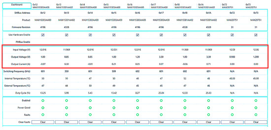 In case the SEL induced failures, the input/output (I/O) currents were detected by a real-time monitoring software (MaximDigitalPower) matched to the Xilinx Ultrascale+ evaluation board (as shown in Figure 1). Since the SEL may induce destructive thermal damages in DUT, more than triple of the initial current values were regarded as the SEL phenomenon. The SEL can be detected using the software, and then the power will be cut-off automatically in case the current surges. Owing to the power-off procedure, the SEL could also result in the removal of the configured bitstream in the DUT, rendering the SEU and SEFI tests invalid.