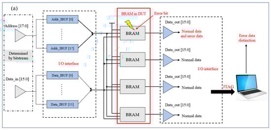 The memory test is mainly aimed to examine the SEU response of the CRAM and BRAM cells in the FPGA. The resource utilization for the memory test is shown in Table 1. The basic structure and the data depth for each BRAM module are shown in Figure 2a. We utilized 100% BRAM by four 16-bit width RAM modules. Few flip-flop (FF) and look-up tables (LUT) were occupied in the implemented project, as shown in Table 1. The bitstreams (bit) together with readback (rbd), mask (msd), and logical location (ll) files were generated by the Vivado software and then uploaded to the computer by the Joint Test Action Group (JTAG) interface. The original bitstream was chosen as a golden file. Meanwhile, the readback bitstreams, operated based on the Tool Command Language (TCL) in Vivado, could be generated dynamically and uploaded to a computer to distinguish the upset data. In addition, the C++ based visual interface was designed to achieve the comparative procedure between the golden file and the readback bitstreams. Then the error information was distinguished, classified, and calculated based on the type of resources.