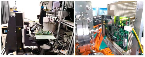 DUT in (a) picosecond laser irradiation platform, (b) the terminal of the heavy-ion beamline.