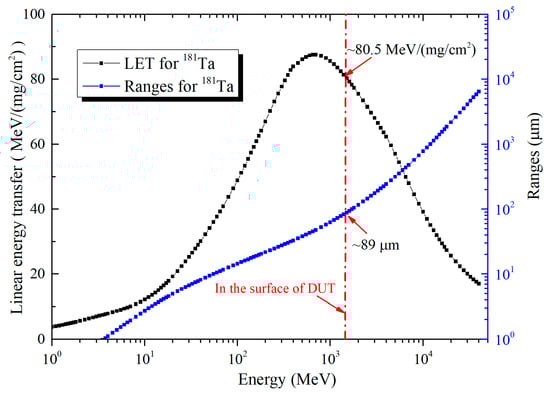 The heavy-ion tests were carried out at the Heavy Ion Research Facility in Lanzhou (HIRFL) at the Institute of Modern Physics, Chinese Academy of Sciences. As shown in Figure 3b, at the HIRFL, the test board was located in the air at the end of the terminal, and a laser beamline could be applied to calibrate the position of the DUT. The area of the beamline was 2.30 cm × 2.3 cm, which could realize a fully covered irradiation. The parameters of the LET values and ranges for 181Ta ions are shown in Figure 4. During the irradiation, high energy 181Ta ions were used with the initial linear energy transfer (LET) value at 80.5 MeV·cm2·mg−1. Considering that the DUT is a flip-chip device with ~490 µm silicon on the top of the die, the silicon substrate was thinned down to 60 µm. This was less than the range of incident ions (~99.3 µm in air/~89.0 µm in DUT surface). Furthermore, the flux of incident ions was controlled in ~3 to ~10 ions·cm−2·s−1 in case the current surged.