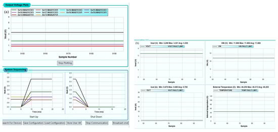 Voltage and current monitoring system. (a) Multiple-channel voltage monitoring, and (b) details of voltages and currents for a single-channel (when the <11.6 nJ laser is used, the voltage, the temperature, and the current are basically stable).