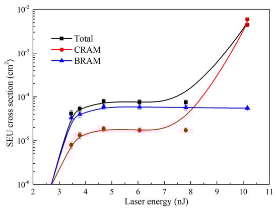 The cross-section results for the configure RAM (CRAM) upset, BRAM upset, and total upset in the FinFET field-programmable gate array (FPGA) vs. laser energy.