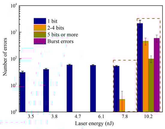 where A is the area of the DUT. The Nupset indicates the total upset bits. T is the nature period of the pulsed laser, and t is the scanning time. The detailed upset results are shown in Figure 6. Compared to the upsets in the BRAM, the upsets in CRAM showed a very low cross-section when the laser energy was below 7.8 nJ. However, high energy (10.2 nJ) will induce a large number of upsets in the CRAM and even dominate the total upsets in the FPGA. Meanwhile, the upsets for the BRAM are roughly the same as that in 7.8 nJ. The successive errors that occurred in adjacent lines or rows of bitstream were regarded as a burst error. As shown in Figure 7, 2- to 4-bit errors were observed in 7.8 nJ or higher energy laser irradiation. More than five bits or burst errors only frequently appeared in 10.2 nJ, which corresponded to the surging of cross-sections in Figure 6 in 10.2 nJ. Besides, no hard error (nonrecoverable by reconfiguration) in the memory cell was observed even when the energy of the laser was increased to ~11.6 nJ. However, when the energy of the laser was >11.6 nJ, the DUT could be damaged by the SEL with an obvious temperature surge in merely 3–5 s. After that, the DUT could not be detected by the hardware manager in Vivado. All the reconfiguration procedures for the thermal damaged DUTs failed.