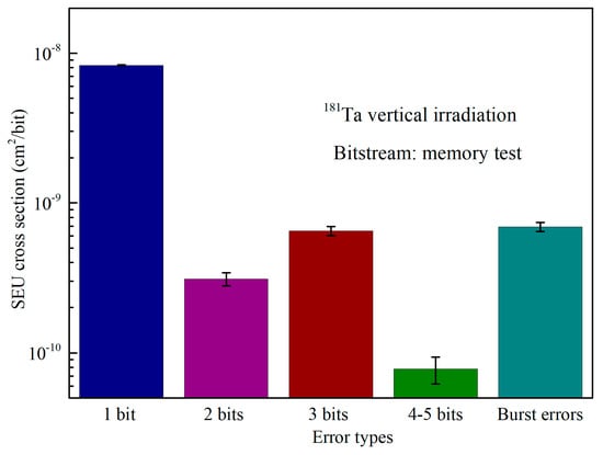 For the SEUs in CRAM, single-bit errors and multiple bit errors were distinguished. As shown in Figure 11, the multiple bit errors usually existed in the LUT and switch array due to their adjacent sensitive nodes. The swift 181Ta ions produced high-density electron-hole pairs, and the severe charge sharing phenomenon widely existed in the bulk process. Thus, we observed the maximal 5-bit errors in the same or contiguous word line and contiguous bit lines. Attention should be paid to this in the hardening design. Similar results for the multi-bit upsets were also discovered in the 28 nm Kintex-7 FPGA, though the LET values used in the irradiation test were not high [].