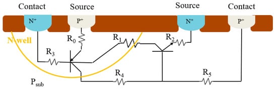 A classical diagram of the parasitic PNPN structure [] (N-well and Psub).