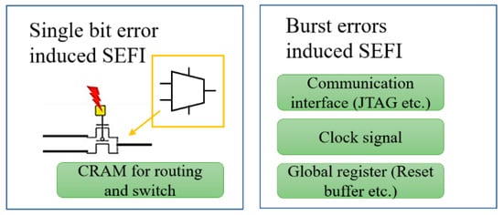 The characterization of SEFI is difficult. As shown in Figure 10, errors in the logic of the communication interface (CI), in the clock or other global registers, or in some essential switches, (CRAM) will lead to SEFI occurrence. The majority of SEFI was caused by errors in the CI and global buffers, resulting in burst errors appearing in the bitstream. However, upsets in some CRAMs may also have had significant influence and are closely associated with SEFI. Meanwhile, the expression of these upsets in bitstreams is usually a single bit error. The ~10−3 cm2/bit to ~10−2 cm2/bit SEFI cross-section results for the DUT were more severe than the other FPGAs with large feature size, which should be concerning for its influence in a radiation environment [,,,,,].
