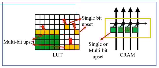 Given its high processing power and configuration flexibility, static random-access memory (SRAM)-based field-programmable gate array (FPGA) has become one of the most fascinating devices in astrionics [,,]. However, particle-induced single event effects (SEE) in SRAM-FPGA have shown diversity and complexity in previous studies. This was because the basic SRAM architectures were sensitive to single event upset (SEU), single event latch-up (SEL), and single event functional interrupt (SEFI). The corruption of logic values like SEU, disturbance of the functionalities like SEFI, and the thermal damage of circuits like SEL have different effects on the FPGA [,,]. Though SEU is not so destructive as SEL, the occurrence of upset errors in FPGA configure RAMs (CRAMs) may change the internal states of the circuits. This may propagate to the primary outputs of circuits and produce bit errors, or even cause system failures [,,,,]. Thus, some typical radiation-hardened FPGAs have been designed and widely employed in space missions [,,,]. However, the rapid advances of commercial-off-the-shelf (COTS) in the field of integrated circuits (IC) have enabled the use of inexpensive and high-performance electronic components that also contributes to the space industry []. As reported in Reference [,], in CubeSats or many commercial missions, using COTS components is becoming the rule rather than an exception, and many COTS are complicated systems. However, to reduce risks in the radiation environment, identifying the sensitive and the essential modules for a hardening designer is necessary.