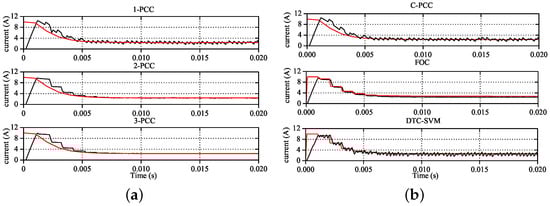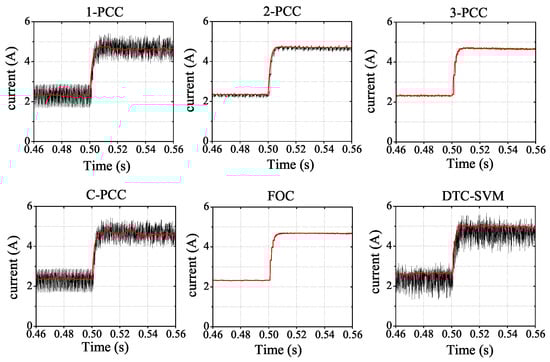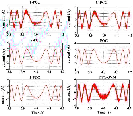 Figure 10, we gradually reduce the rotational speed from 1000 r/min to −1000 r/min at a constant rate within 1 s. The u-phase current regulation capabilities of 1-PCC and C-PCC show same tracking accuracy, but they both encounter large current perturbation when the motor is in counter rotation at the time of 4.0 s. 2-PCC, 3-PCC, and FOC show higher accuracy whether tracking phase current or speed. Similarly, DTC-SVM presents large ripple of u-phase current with the speed adjusted.