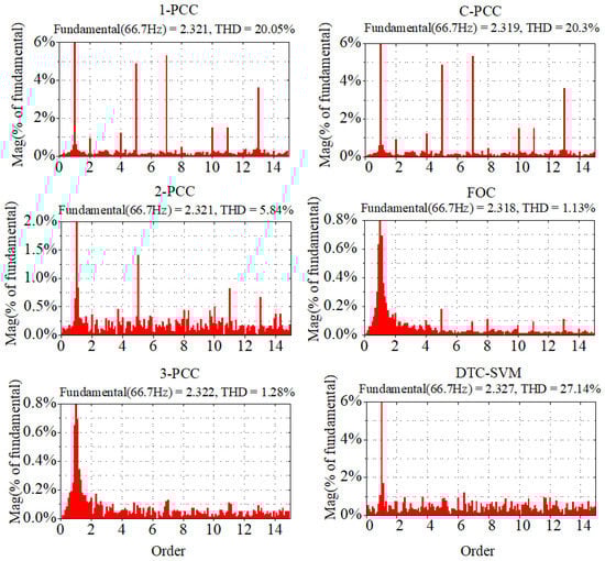 Figure 12, the left column depicts total harmonic distortion (THD) of u-phase current of the proposed PCCs in steady state, with 20.05%, 5.84%, and 1.28% for 1-PCC, 2-PCC, and 3-PCC, respectively. The right column presents the corresponding THD of comparison group. Obviously, the optimal FOC has minimum THD, which is roughly equal to that of 3-PCC. The largest THD belongd to DTC-SVM. The harmonic quality of C-PCC and 1-PCC are similar based on the same current response and THD values. Therefore, the results in