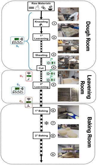 For other types of bread, several optimization strategies were carried out to select the best kneading, leavening or baking parameters. These optimizations employed an extensive mathematical modeling, genetic algorithms or ANN [,,,,,]. Therefore, to the wealth of the Carasau bread manufacturing process, the industrial bread production must be supplied with an ICT, cost-effective tool capable of allowing a real-time, continuous monitoring of the main process parameters. This is why an industrial WSN was developed to permit the successive automation and digitalization of the system in Figure 1, while forecasting the enhancement of its efficiency and productivity; thus, meeting the actual market pressure and competitiveness [,,,].