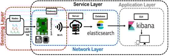 Each of these nodes directly communicate their data to a Raspberry Pi 3 B+ (Raspberry Pi, UK). This commercially available device was selected to act as a processing unit, which, at the same time, can work as sink node, store the information in a memory (see Figure 3) and elaborate the data. For each node a Raspberry unit was used, for a total of seven devices. Moreover, these units’ contemporaries serve as gateway units; thus, linking the sensing layer with the network and service layer, as shown in Figure 2. Indeed, the Raspberry units transmit via Wi-Fi, the data collected, to a server. To organize and manage the rather different type of data acquired, the open-source database Elasticsearch (Elasticsearch, US) was employed. At the network level, the data (.json format) are organized and made available to the application layer (Figure 2). Finally, using the free tool called Kibana (Elasticsearch, US), a GUI was developed to present the data to the user on different devices (e.g., computer, tablet or, possibly, a mobile phone).