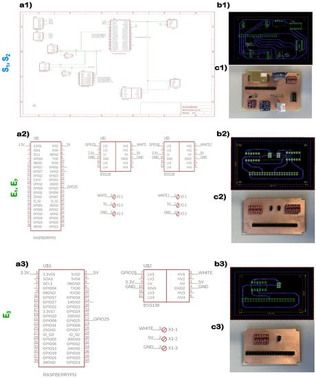 Prototypes of the WSN nodes S and S; and E, E and E. (a1,a2,a3) Schematic of the connections and (b1,b2,b3) snapshots of the designed printed circuit boards (PCBs), from Eagle Autodesk. (c1,c2,c3) Realized PCBs.
