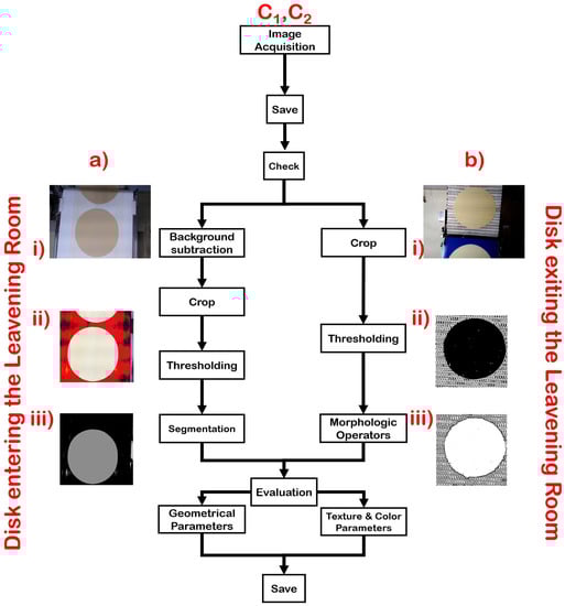 A reference situation for a given disk is defined before the leavening. The background (i.e., the belt and its surrounding region) is first subtracted to reduce the image noise []. Then, the image is cropped to the area of interest containing the dough disks. After a thresholding step using Otsu method [], the image is segmented and the geometrical parameters are extracted [,]. An example of the elaboration steps for the disks entering the leavening room is reported in Figure 4a. In particular, the bread disks are treated as ellipses, in order to assess the deviations from the ideal circular shape. Indeed, the major and minor axes (in pixels) of the ellipse, and the eccentricity, orientation, the roundness, compactness, solidity and convexity of the ellipse, are derived. Moreover, a 256-bit RGB histogram and the local binary pattern (LBP) descriptor are extracted from the segmented bread disk image to characterize, respectively, color and texture information [].
