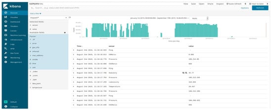 As presented in Figure 2, the data collected and managed by the Elasticsearch database are then presented to the user, exploiting the open-source tool Kibana version 6.4.0 (Elasticsearch, US). The use of a GUI is a real and underestimated need. The fast digitalization trend of Industry 4.0 must cope with the fact that, firstly, some basic in-house competencies may be lacking; e.g., installing the setup of sensors or structuring/interrogating a database with a big amount of data []. Furthermore, the post-processing and statistical elaboration for the heterogeneous ensemble of information derived from the WSN is not trivial []. This is why a simple, but rather effective open-source tool can be used to inform the stakeholders about the monitored parameters, while informing them about statistics or detected events.