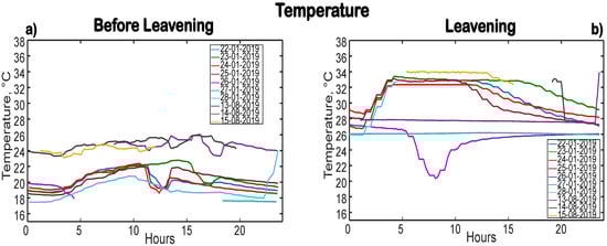 This very simple analysis indicates that in the two processing stages it could be a statistically significant difference. This is why the data collected by the WSN were further analyzed performing the Mann–Whitney U test. When analyzing the quantities in the kneading room and the leavening room during each day of monitoring (during January and August), it is possible to notice in Table 1 that two strongly significant parameters are temperature and CO concentration between the two processing stages. The temperature between the two manufacturing stages stands out as a distinct feature. This is due to the average difference of about 54% in the air temperatures shown in Figure 6a,b. From these findings it is possible to infer that the temperature can be one of the most relevant parameters in the development of an optimized decision process or for any machine learning approach to investigate, as confirmed by [,,,,,,,,,,]. The role of CO concentration in the process needs to be clarified, and, probably, integrated with other physical measurements, such as the rheological characteristics and/or the dielectric properties of the dough [,,].