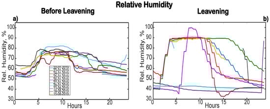 Different considerations hold for the relative humidity data from Figure 7. In the kneading room (Figure 7a), the humidity curves show a lower onset time and areas under curves smaller than those measured in the leavening room (Figure 7b). The average value of relative humidity in the kneading room is 59.98% ± 6.10%, whilst in the leavening room it is 61.26% ± 12.82%. The average humidity values during these phases are about the 50% higher than the prescribed level. Hence, during the crucial phase of second leavening, the standard deviation of water content in air, across days, is two times higher than the value calculated for the initial steps of the process. Provided that the mean values are similar, it should be stressed that during the leavening the behavior of this physical quantity is more variable. Further analyses are required to assess if and in which measure this variation could be significant. However, from the process point of view, the analysis of the WSN data has already allowed to identify another possible cause of interference and disturbance in the bread manufacturing.