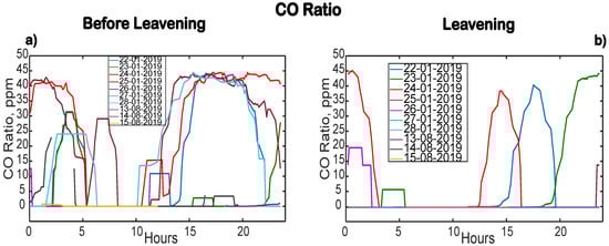 Examples of the data collected during January and August 2019. (a) CO, in ppm, versus time, before leavening, in the dough room. (b) CO, in ppm, versus time, before leavening, in the leavening room.