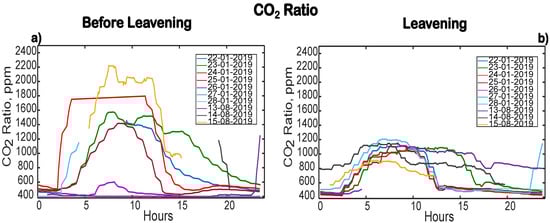 With respect to the CO2 signals, from Figure 8 clear differences can be observed between the two ambients of the plant and stages of the process. In particular, during the leavening, the daily average is 620.26 ppm ± 189.39 ppm, whilst, before, the CO varies around the value of 813.257 ppm, considering a standard deviation of ± 232.74 ppm across the different days of monitoring. Furthermore, when observing the CO signal, in Figure 9a, it is possible to track the interval of activity of the company. Of course this signal arises by two sources: the humans and the dough/bread. The separation of the contribution is not trivial, but it may be an interesting point to investigate in order to gain further knowledge about the first leavening and its final impact in the product quality.
