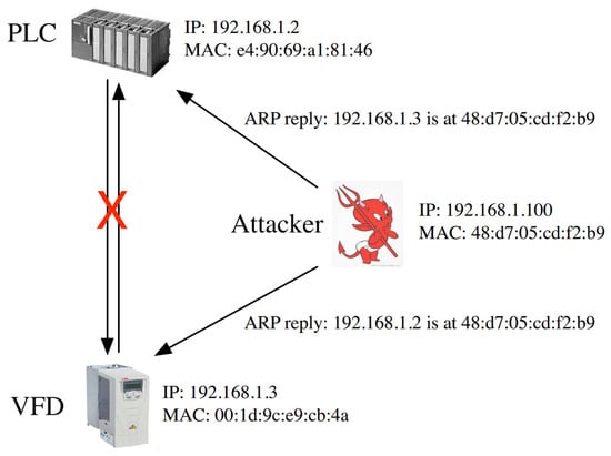 According to the results of the device enumeration, the ARP spoof can be implemented to hijack the Ethernet/IP session between the PLC and VFD. The ARP was used to convert an IP address (network layer address) to the MAC address (link layer address). By sending a malicious ARP reply, attackers can be disguised as a VFD in front of a PLC, as shown in Figure 2, and spoof the VFD in the same way. With the ARP spoof, attackers can hijack the Ethernet/IP session and monitor the data flow between the PLC and VFD. The communication packets between the PLC and VFD were based on explicit messaging in Ethernet/IP. It mainly included two parts: periodic maintenance and control instructions. The periodic maintenance packets refer to the read and write messaging for device parameters, which used the class code (e.g., 0x93) and the whole period including the request. The control instructions contained rotate clockwise with function code (e.g., 0x2A), rotate anticlockwise with, e.g., 0x29, stall clockwise with, e.g., 0x01, and stall anticlockwise with, e.g., 0x19. The specific rotate speed was appended after the function code.