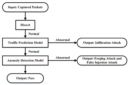 The attack models proposed in Section 4 were feasible and practical because Ethernet/IP does not define any explicit or implicit security mechanisms. In order to protect the ICS from these threats, a two stage IDS for the ICS networks based on Ethernet/IP is proposed. The two stage IDS was located in the process monitor layer, as shown in Figure 1, and its workflow is shown in Figure 3. The inputs were captured packets in one time slot, which could be modified by users. The two stage IDS had the ability to capture and analyze all communication packets from the monitoring port on the industrial router. Besides that, it used the libpcap technique to capture packets and dissected all the Ethernet/IP packets by running our Python scripts. In the Python scripts, the Ethernet/IP packets layer was dissected by layer and obtained necessary information according to the key fields, such as the control instructions in Section 4.