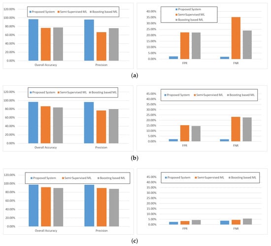 The simulation results are shown in Figure 5. It is depicted in Figure 5 that almost all the algorithms were improving as the training dataset size increased. When the data size was large, the overall accuracy and precision rate of all the methods could obtain an acceptable performance; both the overall accuracy and precision rate were more than 85%, which is shown in Figure 5c. However, when the data size was small, the proposed method performed better than the others, which is shown in Figure 5a. Furthermore, when the data size increased by about six times, the FPR of the two machine learning methods dropped from the highest of more than 20% to below 5%. Furthermore, the FNR dropped from more than 35% to 6%. This means that as the data size increased, the machine learning based performed better, and the smallest data size would be selected as 6646. Comparatively, the proposed method in this paper performed much better when the data size was small. As the data size increased, the performance even became less effective, which may be because as the training data size was enlarged, the classification model was overfitted.