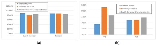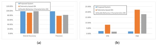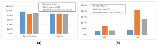 As shown in Figure 6, when the simulation was carried out under infiltration attacks, the proposed two stage IDS approach performed much better than the other two IDS methods, which was because the proposed method could detect the infiltration attacks by the traffic detection model. For the overall accuracy, the three selected methods all performed well, and the accuracy of the proposed method was better than 95%. Correspondingly, the precision rate performance of the proposed method was about 20% better than the other two methods, which means the proposed method could predict the attack instance more precisely, as shown in Figure 6a. Furthermore, the double behavior characteristics IDS method could perform well in FPR metrics, and not very well for FNR, which was because this method could classify more normal data into the attack group, as shown in Figure 6b. According to the simulation results, the proposed method could detect the infiltration attacks precisely.