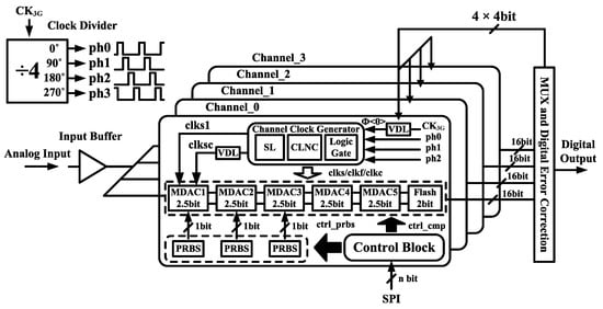 Proposed four-channel time-interleaved pipelined analog-to-digital converter (ADC).
