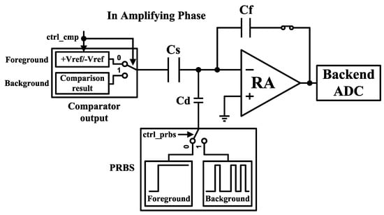 Compared with the 1-bit redundancy MDAC, the 0.5-bit can save one comparator per stage and avoid the offset of ADC output []. Therefore, the 0.5-bit redundancy MDAC as shown in Figure 8 is employed in the pipelined ADC of this paper. To avoid the additional driving circuits in the calibration for 0.5-bit redundancy, this paper developed a zero-input-based foreground calibration with an improved bit-weight measurement.