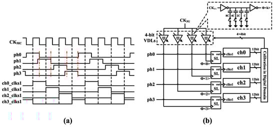 Figure 3a shows the ideal timing diagram for master clock sampling. The ph0~ph3 are the divided clocks in Figure 1. They suffer from the time skew caused by the different signal path and the variation in the delay gates, which results in the different phase shifts between two adjacent of clocks, as shown in Figure 3a. Therefore, ph0~ph3 are not directly used as the sampling clocks. The master clock sampling is a widely used technique [,] to reduce the time skew. CK is the master clock that has a sufficiently low clock jitter to drive each clock block on the chip. The sampling clocks (ch0_clks1~ch3_clks1) are retimed with the CK. Theoretically, the sampling clocks should have been optimally aligned with the rising edges of the master clock. Nevertheless the achievable sampling skew is usually limited to several hundreds of femtosecond (RMS) due to the layout parasitics associated with the sampling clocks and the mismatches of related devices. The delay-adjusting is a general technique that deals with the time skew for the time-interleaved ADC with high resolution [] or ultra-high sampling rate []. However it usually takes a massive capacitor array (≥7 bits) to achieve both wide correction range and small step size.