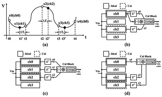 (a) The sampled waveform with time skew; Block diagram for the detection of the timing mismatch (b) T2, (c) T1 and (d) T3.
