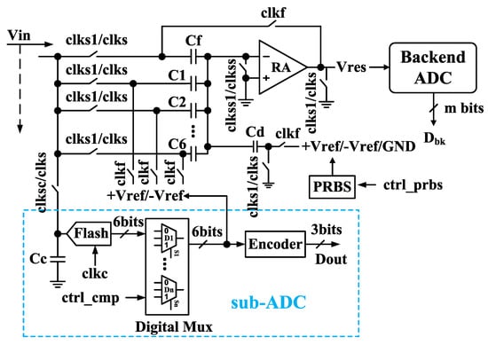 The operation of sub-ADC is usually performed in the non-overlapping time []. But the long non-overlapping time results in a short settling time for the RA. When the sub-ADC takes 10% of unit conversion period (UCP) to make its decision, just about 35% of UCP is left for the RA output to settle to the needed accuracy []. With this clock scheme, the blocks with high power consumption are needed to achieve high conversion speed, such as the high-speed comparators and the RA with high gain-bandwidth product [,]. The early comparison scheme [] is adopted to relax the speed requirement for both comparators and RA, saving the power consumption.