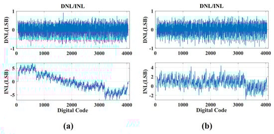 The static performance of DNL/INL(a) with and (b) without the zero-input-based calibration.