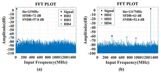 The measured fast Fourier transform (FFT) spectrum at 3GSps for the input frequency (a) 23 MHz and (b) 1317 MHz.