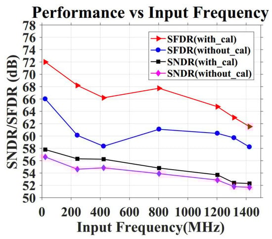 Figure 13 shows the SFDR and SNDR performance with and without calibration versus the input frequency. The best improvement of about 8 dB is achieved for SFDR by the developed calibration. When the input frequency is above 800 MHz, the improvement of the calibration is attenuated with respect to the input frequency. Meanwhile, the SNDR is slightly improved by the calibration.