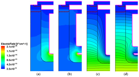The floating electrode can be regarded as an equipotential body in the electric field, and the surface of the floating electrode can be regarded as an equipotential surface. Therefore, the equipotential action of the floating electrode leads the high potential of the drain terminal to the source region with a low potential, and modulates the electric field of the drift region. It is similar to the resurf principle, which extends the depletion region to the entire drift region to reduce a high electric field at the surface of the source. As can be seen from Figure 2c,d, a portion of the dense potential lines at the bottom of the trench are transferred to the upper and middle area of the trench, and the potential lines are more evenly distributed in the drift region, because of the equipotential action of the floating electrode. In addition, the distribution of the electric field for the FSGRSO UMOSFET is more uniform than that of the SGRSO UMOSFET, as shown in Figure 2a,b. Therefore, the FSGRSO UMOSFET exhibits a higher BV and FOM.