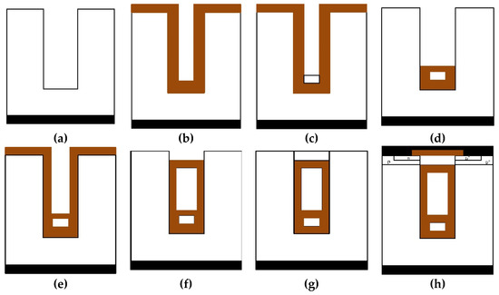 The process for the fabrication of the FSGRSO UMOSFET is similar to that of the basic SGRSO UMOSFET structure, as shown in Figure 3. This device structure was fabricated by starting with an n-type epitaxial layer grown on a heavily doped N+ substrate. Next, a deep trench was formed by reactive ion etching. Then, a thick oxide was thermally grown on the trench surface and etched off to smooth the trench corners (a). Next, a 1.2-μm oxide was deposited on the trench surface (b). The trench was then refilled with highly doped n-type polysilicon, and etched back to the depth (c). Afterward, the trench was refilled with oxide by depositing it again. All of the exposed oxide in the trench was removed, except for a thicker oxide, which served as an isolation oxide between the floating and the source electrodes (d). Subsequently, a thick oxide and n-type polysilicon were deposited again in the trench. The polysilicon was then etched until it was recessed below the surface to a depth slightly below the depth of the p-base region (e). Then, the thick oxide was etched back and a 50-nm oxide was thermally grown on the trench sidewalls to form the gate oxide (f). Following this, a third polysilicon layer was deposited and etched back to the surface to serve as the gate electrode (g). Finally, the p+ and n+ ions were implanted for the source region, and the device fabrication was then completed by the deposition of the source metal layer (h).