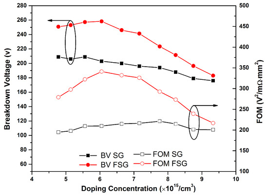 Dependence of the breakdown (BV) and figure of merit (FOM) on the doping concentration.