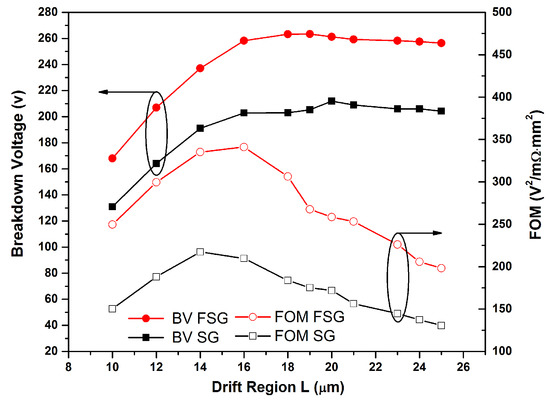 The dependence of the BV and FOM on the thickness of the drift region (L) is shown in Figure 6 at a 3.4-μm mesa width for the two structures. The results show that the trends of the BV and FOM, depending on the thickness of the drift region, were similar for the FSGRSO and SGRSO UMOSFETs. Furthermore, the BV and FOM (BV2/Rsp) of the FSGRSO UMOSFET were higher than that of the SGRSO UMOSFET in 10–25 μm, due to the floating electrode. The breakdown voltage of the two devices rose and stabilized gradually with the increase of the drift region thickness. However, the FOM value decreased as the L increased above 16 μm, and achieved a maximum value when the L was 16 μm, because of the increase of RSP with the drift region thickness. Its optimum FOM and BV improved by 66.8% and 29.7%, respectively, compared with that of the SGRSO UMOSFET when the L was 16 μm, as shown in Figure 6.